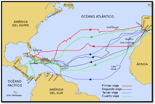 Cristóbal Colón, en representación de los Reyes de España, realizó cuatro famosos viajes desde Europa a América en 1492, 1493, 1498 y 1502. En el primero de ellos llegó a América el 12 de octubre de 1492, a una isla de las Bahamas llamada Guanahani.