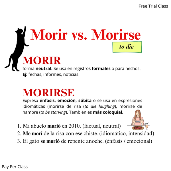 Expresa énfasis, emoción, súbita o se usa en expresiones idiomáticas (morirse de risa (to die laughing), morirse de hambre (to be starving). También es más coloquial.