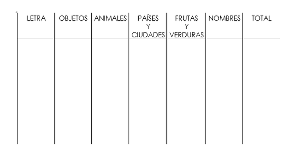 Las categorías las deciden deben ser las mismas para todos los participantes. Algunas de las más populares son: países y ciudades, frutas y verduras, cosas, animales, nombres y objetos.